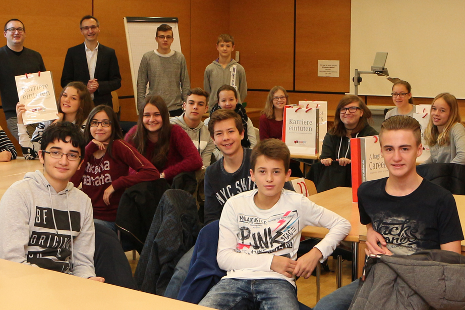 Initiiert von Prof. Dr. Vera Döring fand am vergangenen Donnerstag an der Studienakademie das erste Schülerfirma-Projekt statt. Zu Gast war die Klasse 8c der Villinger Karl-Brachat-Realschule begleitet von ihrem Klassenlehrer Matthias Breithaupt und Referendar Florian Reinauer. Die Schülerinnen und Schüler wurden von Prof. Dr. Clemens Wangler und Henriette Stanley empfangen und lernten die Hochschule anhand einer kurzen Präsentation kennen. Dann stellten die Schüler ihr Projekt vor, bei dem es sich um ein selbst verfasstes und verlegtes Mathebuch in englischer Sprache mit dem Titel "Make Math Great Again" handelt. Die Schülerfirma ist wie ein privatwirtschaftliches Unternehmen organisiert und hat Abteilungen mit Aufgaben wie Einkauf, Finanzen, Marketing, Produktion, Recht und Verkauf. Der Klasse wurden verschiedene Finanzierungsmöglichkeiten für ihr Projekt vorgestellt. Clemens Wangler ging sowohl auf die klassischen Eigen- und Fremdfinanzierungsmöglichkeiten als auch auf neuere Methoden wie Crowdfunding ein. Abschließend wurde in Gruppen erarbeitet und präsentiert, welche Finanzierungsformen für das Projekt in Frage kommen.  Das Buch soll im nächsten Jahr auf den Markt kommen. Fachdidaktisch betrachtet, geht es Matthias Breithaupt bei dem Projekt um die Aufbereitung und Darstellung von Texten, strategisches Vorgehen und fächerverbindendes Denken. Wirtschaftsmathematische Aspekte, unterrichtet auf Klassenstufenniveau, sind beispielsweise die Preisfindung zwischen Marketing und Kostenkalkulation sowie die richtige Finanzierungsstrategie. "Die Mathethemen im Buch entsprechen nicht dem Curriculum, es geht eher um Themen, für die im Unterricht keine Zeit bleibt", sagt der Lehrer. So gibt es zum Beispiel Logikrätsel. Darüber hinaus wird darauf eingegangen, was Mathe mit Kochen, Musik, Natur und Design zu tun hat. Zielgruppen für das Buch sind vor allem Englisch- und Mathematikfachschaften von Schulen. Die Schüler der 8c zusammen mit Referendar Florian Reinauer, Klassenlehrer