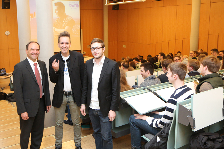 Unverhofft und mit Effet wirft Gerald Hörhan während seines Vortrags eine Banane ins Publikum. Das darauffolgende Gelächter lockert die Stimmung unter den rund 150 Teilnehmern, vorwiegend Studierende. Den Bestsellerautoren, Immobilieninvestor und Harvard Absolventen Gerald Hörhan an die Duale Hochschule Baden-Württemberg zu holen, ist Benjamin Heilani, Student im Studiengang Bank, gelungen. Er empfing den Gast gestern sogar persönlich am Stuttgarter Bahnhof und eskortierte ihn zusammen mit dessen beiden Begleitern nach Villingen-Schwenningen. Prof. Dr. Marcus Vögtle erwähnte in seiner Begrüßung die Bekanntheit des Gastes aus Funk und Fernsehen. Diesem ist, wie er sagt, seine Medienpräsenz auf Facebook und YouTube allerdings noch wichtiger. Denn die Welt ist digital in allen Bereichen und Branchen. Die Gefahr aufgrund von Shitstorms Imageschäden zu erleiden, sei groß. Dies zeigt er anhand eines fünfmillionenfach angeklickten YouTube-Beitrags eines Passagiers auf, dessen Fluggepäck beschädigt worden war. Die anschließende Schadensabwicklung von Seiten der Fluggesellschaft lief nicht zu seiner Zufriedenheit. Die Zukunftsprognosen des Investmentpunks, wie sich Gerald Hörhan selbst aufgrund seiner äußerlichen Erscheinung und seiner ehemaligen Tätigkeit als Investmentbanker bezeichnet, sind nicht rosig. Er sieht eine große Arbeitslosigkeit kommen, da Arbeitskräfte im Zuge technischer Entwicklungen nicht mehr in der Masse gebraucht werden. Der Mittelstand werde seiner Meinung nach schwinden, und bildlich gesprochen werde eine neue chinesische Mauer zwischen arm und reich erwachsen. Mit Fragen und Bananen seine Zuhörer bombardierend, riet Gerald Hörhan programmieren zu können und Kenntnisse im online-Marketing zu haben. „Branchen schreien nach Veränderung“, da steckt noch viel Potential für die New Economy drin. Eine große Fan Community in digitalen Medien, gelungene online-Auftritte, die viele Klicks generieren, sind aus Sicht des Österreichers erfolgversprechende Strategien und eventuell der Beginn für ein eigenes Start-up Unternehmen. „Baut euch eine eigene online-Marke auf“, ist sein Rat dafür, wie sich Geld verdienen lässt. Google und Amazon, Bill Gates und Marc Zuckerberg hätten bewiesen, wie es gehe. Schon mit 13 Jahren geht es Gerald Hörhan durch den Kopf, später nicht als Arbeitnehmer von morgens bis abends schuften zu wollen, um sich danach noch um Haushalt und Eigenheim zu kümmern. Er nimmt sich vor, einmal viel Geld zu verdienen und reich zu werden. Das ist ihm wohl auch gelungen, denn die Höhe seines Vermögens liege im zweistelligen Millionenbereich, sagt der Geschäftsmann, nachdem ihn ein Zuhörer direkt danach befragt. Deshalb appelliert er an junge Menschen Visionen zu haben, mit Besessenheit und Fleiß Ziele zu verfolgen und dabei authentisch zu bleiben. Dem flippig, sympathischen Typ Gerald Hörhan ist es gelungen, gestern Abend zu begeistern und einen Campus Abend der etwas anderen Art darzubieten.